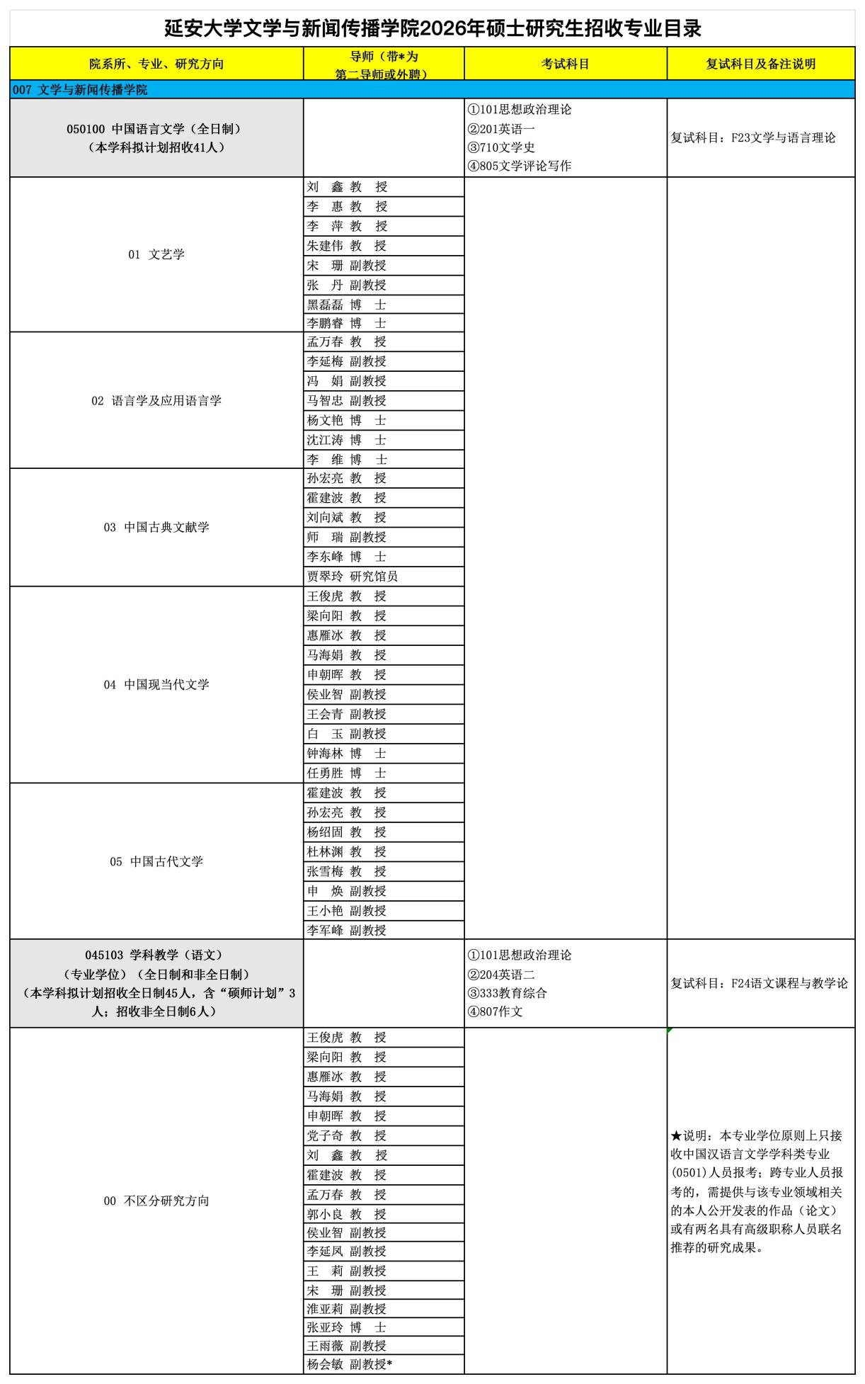 延安大学文学与新闻传播学院(简称文学院)重建于1958年,是延安大学恢复重建时最早设立的三个系科之一。现有中国语言文学一级学科和中国现当代文学、文艺学、中国古代文学、语言学及应用语言学、中国古典文献学、学科教学(语文)、广播电视艺术7个硕士学位授予点。硕士研究生导师53人,其中校内导师40人、校外兼职导师13人,在校硕士研究生人数230人。