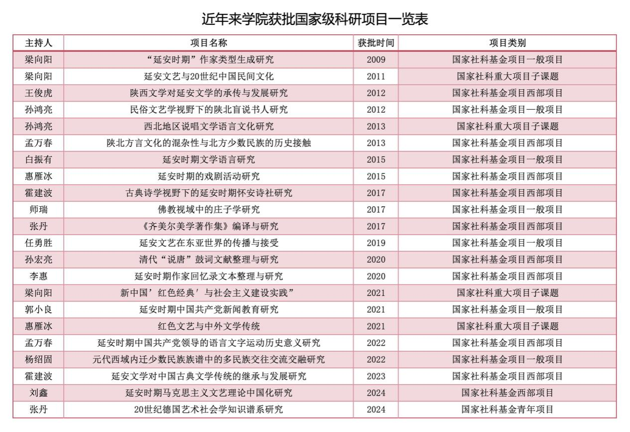 学院现有教职工79人,其中,专任教师69人,含教授19人(其中,二级教授3人,三级教授3人,“银铃计划”3人)、副教授23人,具有博士学位教师36人,享有国务院政府特殊津贴专家2人,全国宝钢优秀教师3人,陕西省“特支计划”人才2人,陕西省“百优计划”人才1人,陕西省教学名师3人,陕西省“三秦人才”1人,“中国高校人文社科学者期刊论文排行榜”入选学者1人,陕西省宣传思想文化系统“四个一批”人才1人,陕西省先进工作者1人,陕西高校青年英才支持计划1人,陕西省高等学校教学指导委员会委员3人,陕西省课程思政教学标兵、教学能手各1人。现有《陕甘宁边区新闻事业——走进红色新闻历史现场》国家级课程思政示范课程1门,《红色经典导论》《新闻调查实务》国家级一流课程2门,《陕甘宁边区新闻事业——走进红色新闻历史现场》《延安文艺运动史》《马克思主义文艺理论》3门省级课程思政示范课程,《红色经典导论》《新闻调查实务》《路遥研究》《中国古代文学(一)(二)》《延安文艺中的那些人、那些事儿》《古典小说名著选讲》6门省级一流课程,《中国现代文学》《中国古代文学》《中国当代文学》《陕北说书》《红色经典艺术大讲堂》5门省级精品资源共享课程。拥有国家级课程思政示范教学团队1个,省级课程思政示范教学团队2个,中国现当代文学、中国古代文学省级教学团队2个。近年来,学院教师获批国家社科基金项目22项,获得陕西省高等教育教学成果奖6项,陕西省优秀教材一等奖2项,获得陕西省哲学社会科学优秀成果奖8项,出版学术专著18部。普通本科生、研究生在校人数1400余人。